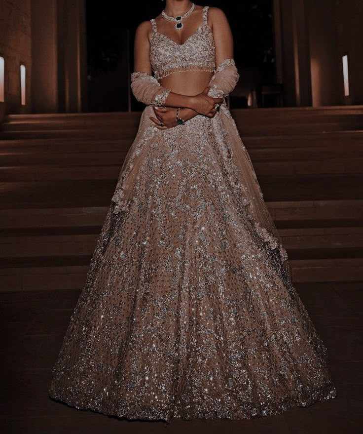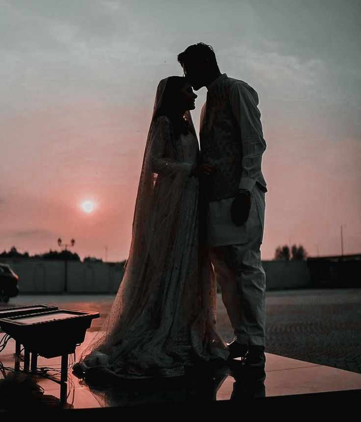 And she followed, her lehenga shimmering with each movement, her earrings brushing against her cheeks as she looked up at him.